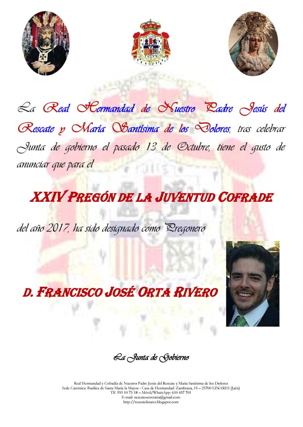 Don Francisco Jose Orta Rivero nombrado por el Rescate XXIV Pregonero de Juventud Cofrade
