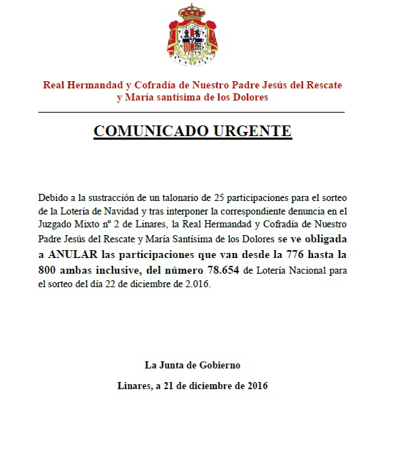La Hermandad del Rescate quiere dar difusión al siguiente comunicado .