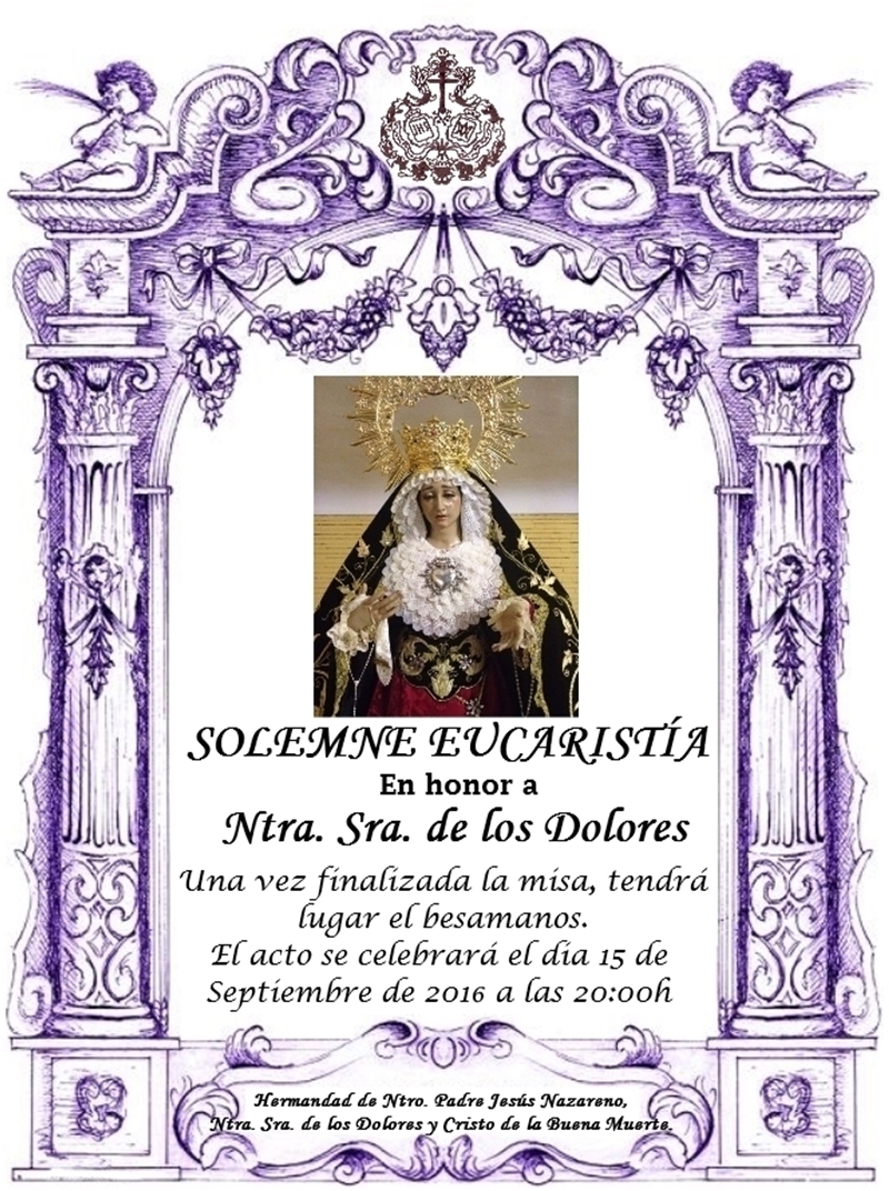 El próximo 15 de septiembre a las 20 horas se celebrará una Eucaristía en la parroquia de la Estación de Linares-Baeza en honor a la Virgen de los Dolores , titular de la Hermandad del Nazareno de la Estación. La misa concluirá con el besamanos de la bendita imagen.