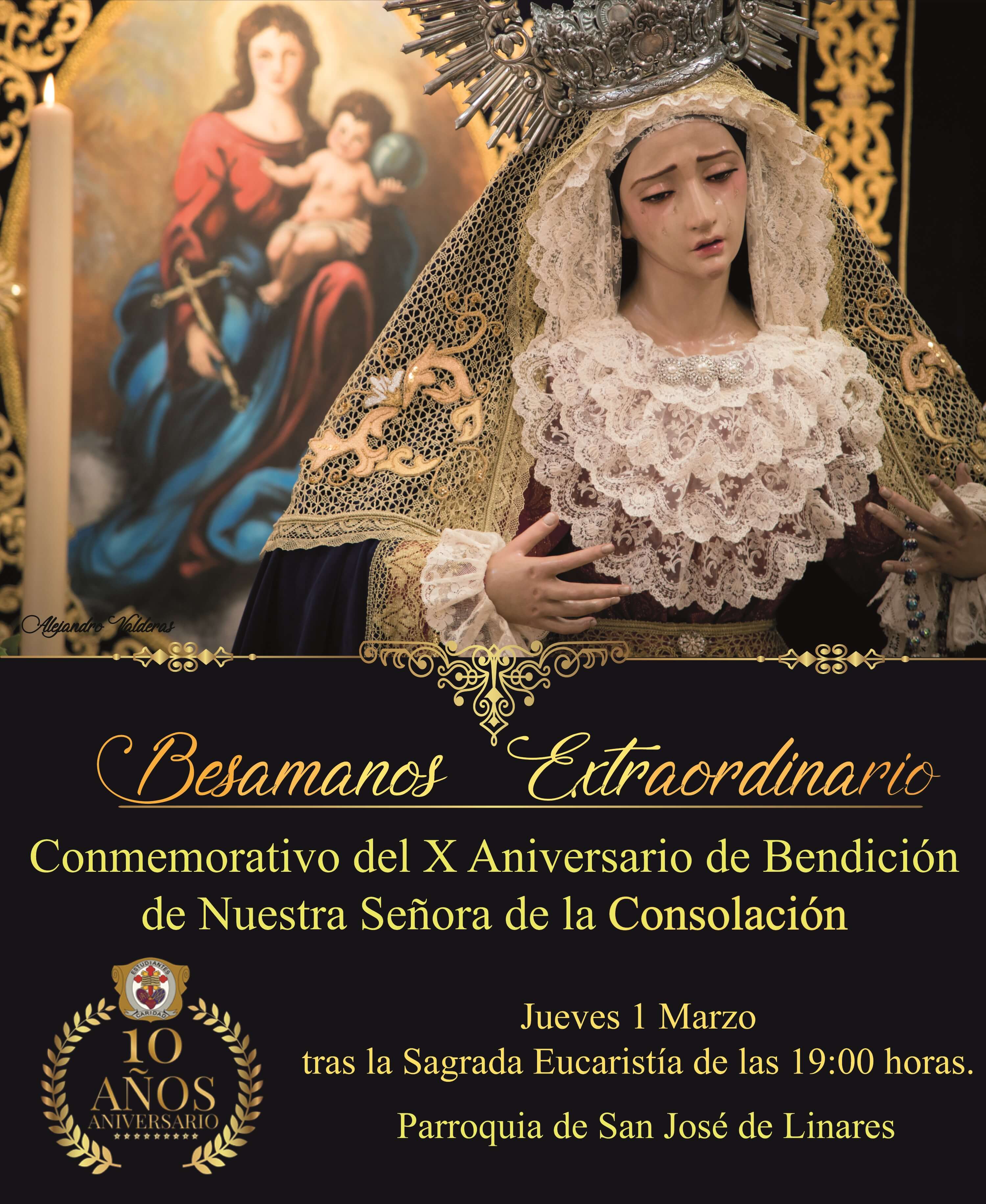 Este jueves, 1 de marzo, la Hermandad de las Siete Palabras celebrará un Besamanos extraordinario por el décimo aniversario de la bendición de su Titular Mariana, Ntra. Sra. de la Consolación. Será tras la Eucaristía de las 19:00 horas, en la Parroquia de San José. Asimismo, durante dicha Misa, tendrá lugar la toma de posesión de la nueva Junta de Gobierno de la Cofradía, encabezada por Dña. Manuela Soriano Lanzas como Hermana Mayor.