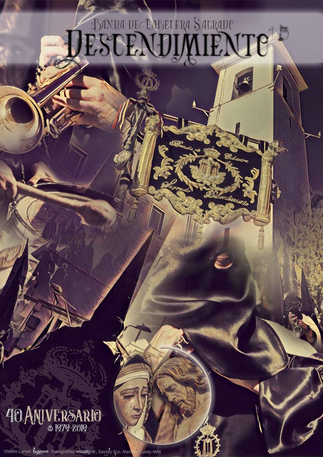 La Banda de Cabecera del Descendimiento cumple 40 años y, con tal motivo, la Hermandad ha editado un cartel y un logo conmemorativos que fueron diseñados por Antonio Jesús Martínez Fernández 'Savio'. Ambas obras fueron presentadas, en la Parroquia de Santa Bárbara, tras la reciente toma de posesión de Dña. Cecilia Rus Ballesteros como Hermana Mayor de la citada Cofradía. Aprovechamos la ocasión para transmitir desde estas líneas nuestros mejores deseos, tanto a ella como a su Junta de Gobierno, en este nuevo mandato que comienza.