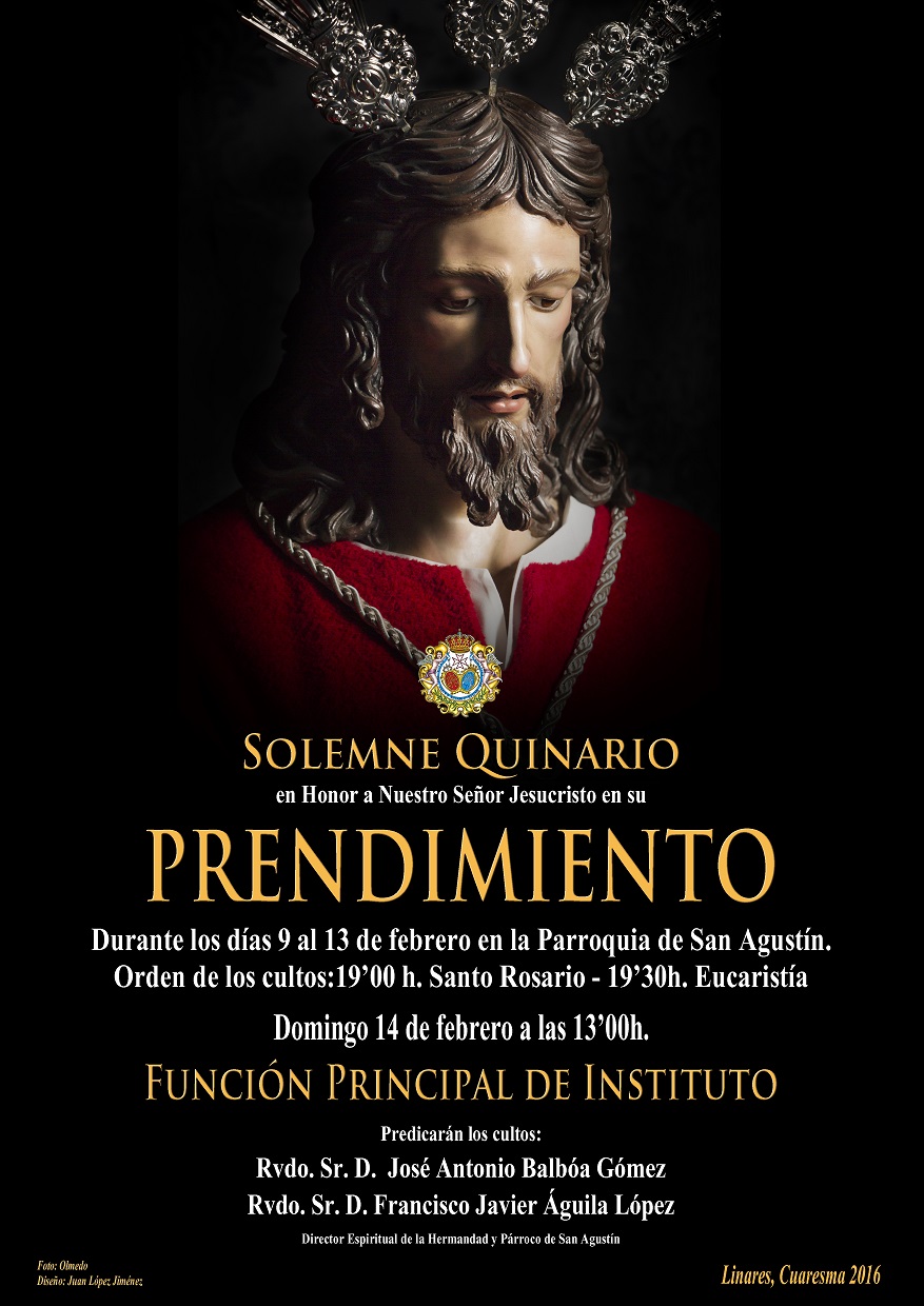 A partir de mañana día 9 en la parroquia de San Agustín y hasta el día 13 a partir de las 19.30 de la tarde se celebrará Solemne Quinario a Jesús Prendido , culminando con la Función Pricipal de Instituto el domingo 14 a las una del mediodía.