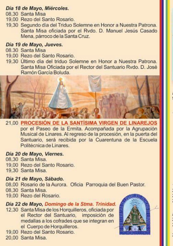 Las Fiestas del Voto 2016 vienen desarrollandose desde el pasado día 14 y hasta el 22 de mayo que finalizarán. Ayer comenzó el Triduo a Nuestra Señora que culminará mañana jueves a las 19.30horas .A continuación la Virgen de Linarejos Coronada procesionará por los alrededores del Santuario acompañada de las Hermandades y Cofradías de la ciudad.