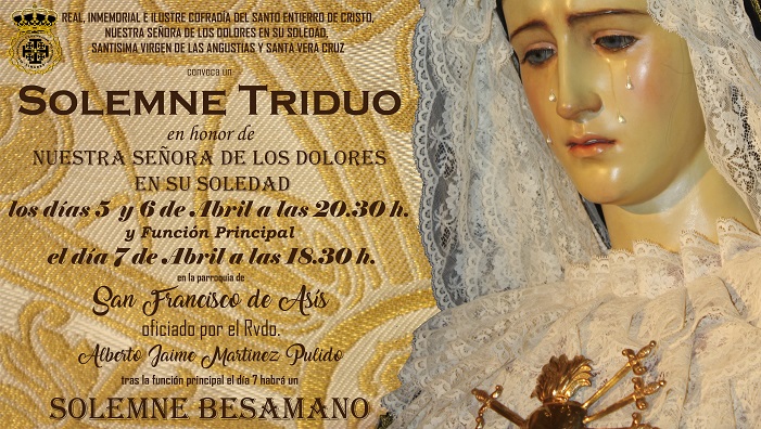 Continúa el triduo que celebra la Cofradía del Santo Entierro a Ntra. Sra. de los Dolores en su Soledad en la Parroquia de San Agustín y que concluirá mañana Viernes de Dolores a las 18.30 horas. La imgen estará mañana expuesta en besamanos.
