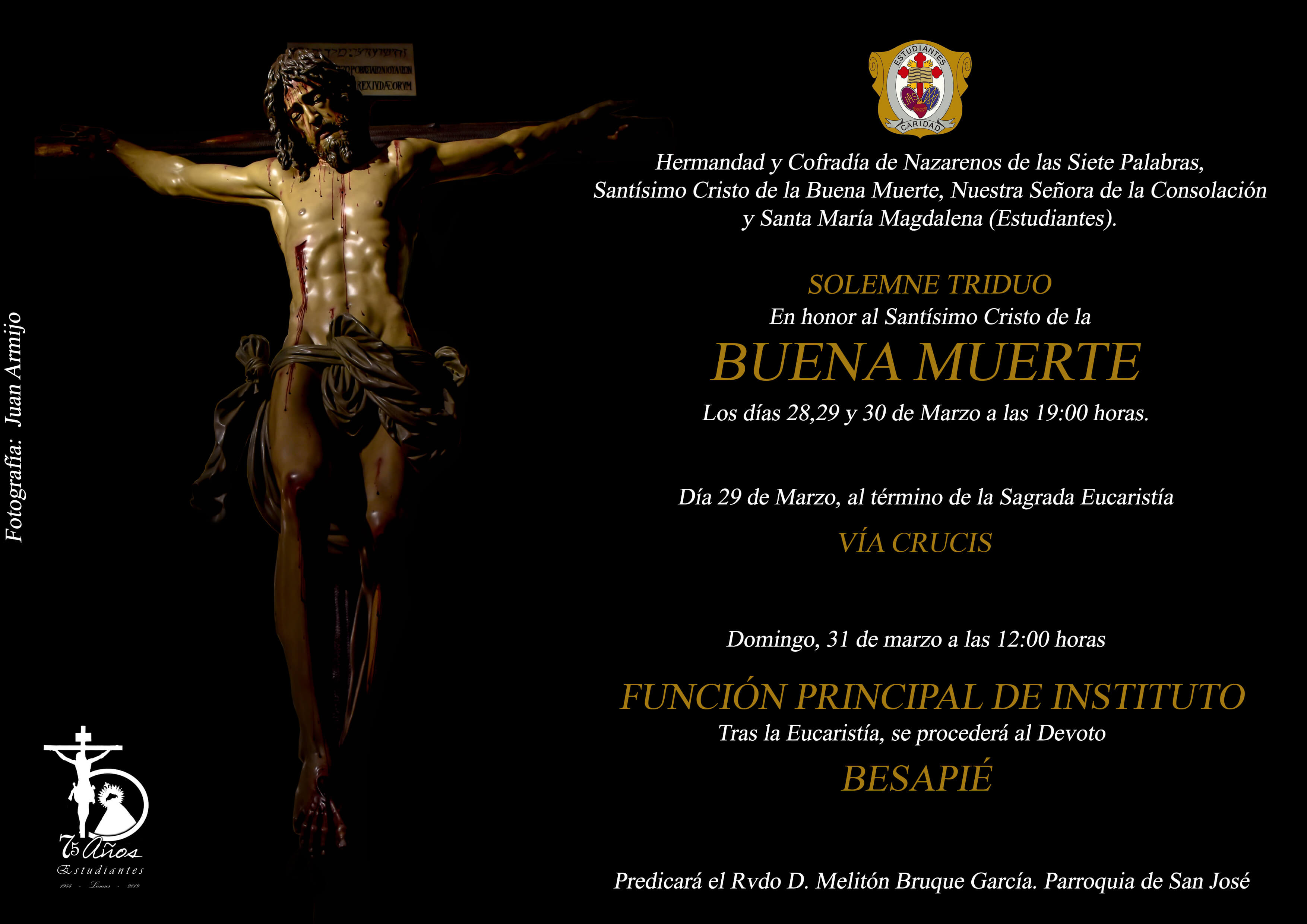 La Hermandad de los Estudiantes celebra la próxima semana los cultos cuaresmales en honor de su Titular, el Santísimo Cristo de la Buena Muerte. La Función Principal será el domingo, día 31 de marzo, y su Vía Crucis tendrá lugar dos días antes, el 29.