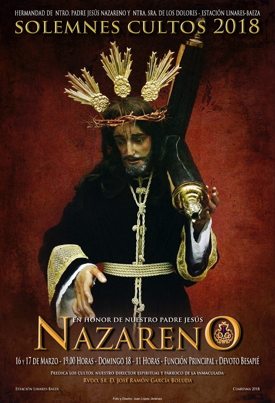 La Hermandad del Nazareno de la Estación Linares-Baeza celebra este fin de semana los Cultos en honor de su primer Titular. El Triduo comenzará mañana, viernes, a las 19:00 horas, en la Parroquia de la Inmaculada Concepción. La Función Principal y el posterior Besapié al Cristo tendrán lugar el domingo, día 18, a partir de las once de la mañana. Predicará el Rvdo. Sr. D. José Ramón García Boluda, Director Espiritual de la Cofradía.