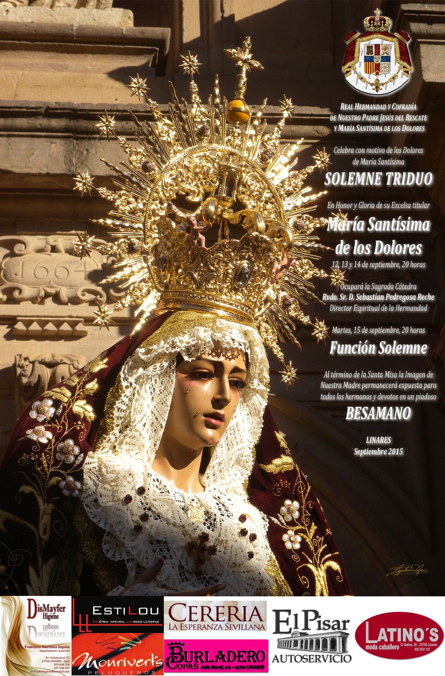Los dias 12, 13 y 14 de Septiembre la Hermandad del Rescate celebrará Triduo a María Stma. de los Dolores que culminará con una misa solemne el día de su festividad. En este día 15 de septiembre la imagen permanecerá en devoto besamano.