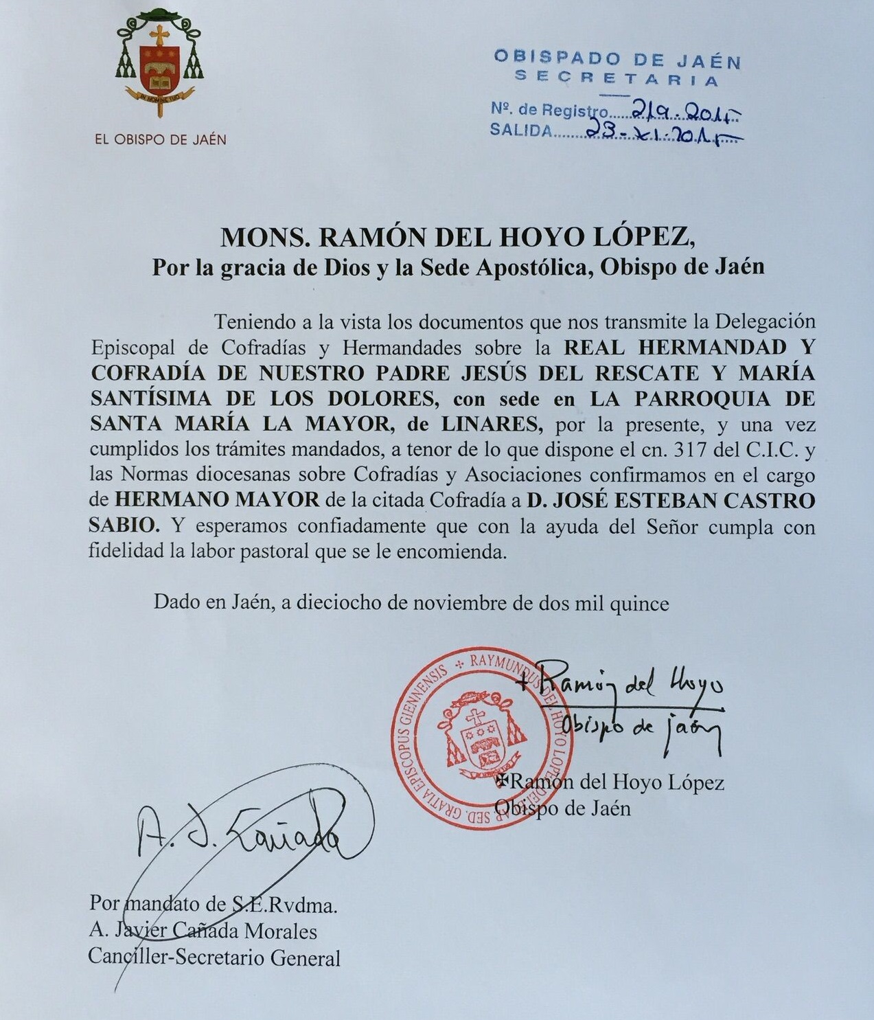 Con la recepción del nombramiento de Don Esteban Castro Sabio como Hermano Mayor del Rescate desde del Obispado de Jaén, pasa a ser Hermano mayor de pleno derecho.