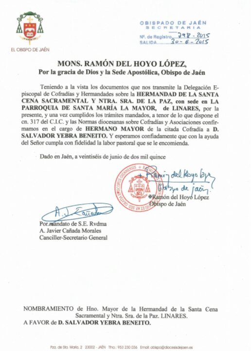 Tras la celebración de las elecciones y tras recibir el correspondiente nombramiento por parte del Obispado de Jaén, Don Salvador Yebra Beneito es oficialmente Hermano Mayor de la Santa Cena Sacramental. Lo acompañan don José Antonio Arquillos Pino y Don Juan Carlos García Jiménez como Vice Hermano Mayor y Administrador respectivamente.