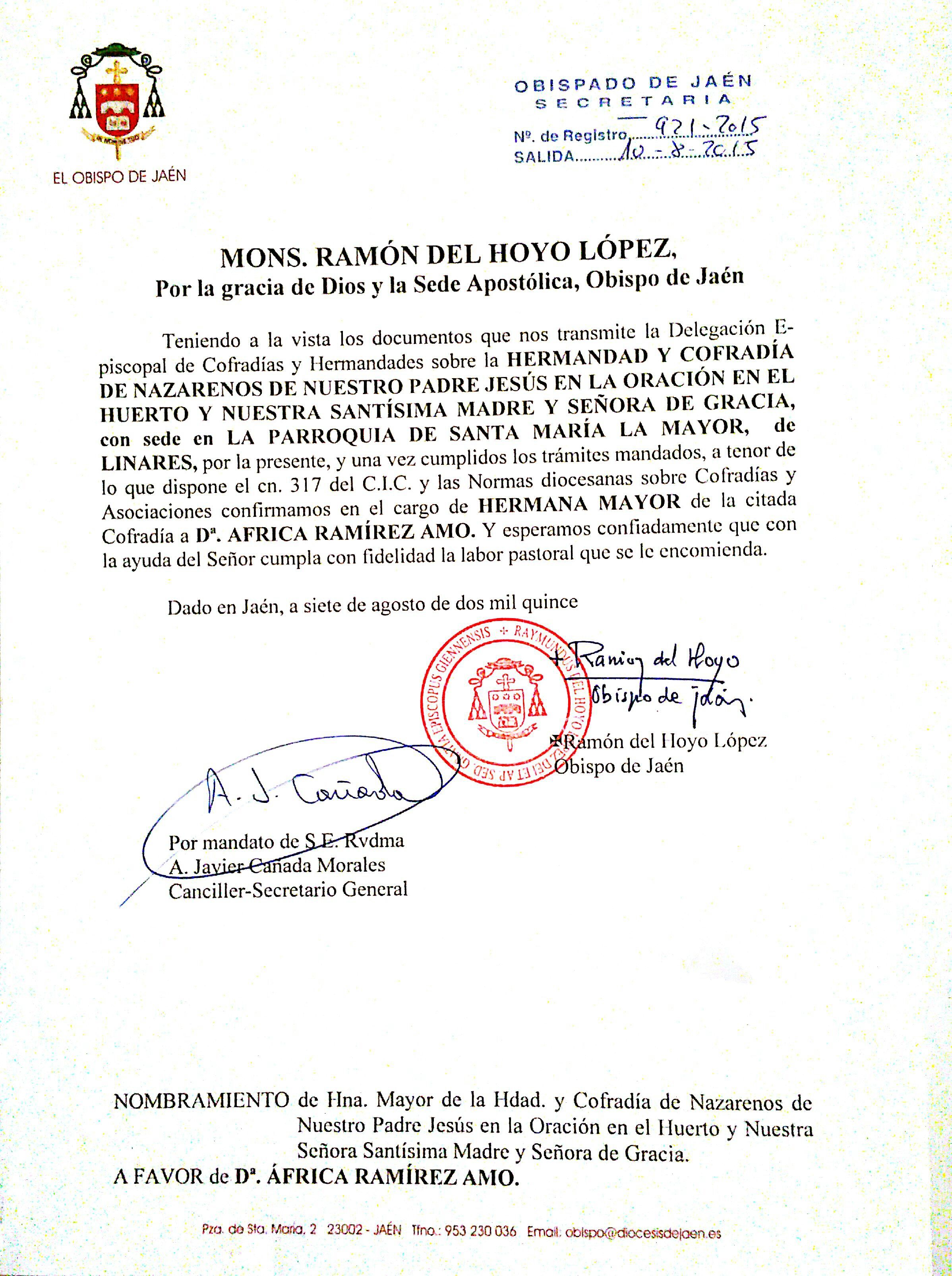Doña África Ramírez Amo ha recibido el nombramiento como Hermana Mayor de la Hermandad de la Oración en el Huerto desde el obsipado de Jaén. De este modo es ratificada tras las elecciones celebradas el día 12 de julio pasado.