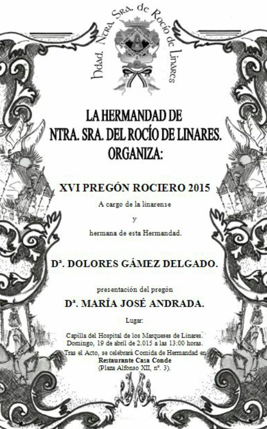 El XVI Pregón Rociero de la Hermandad de Ntra. Sra. del Rocío de Linares será pronunciado por Doña Dolores Gámez Delgado . La Presentadora será Doña María José Andrada. Tendrá lugar el 19 de bril a las 13 horas en la Capilla del Hospital de los Marqueses de Linares.