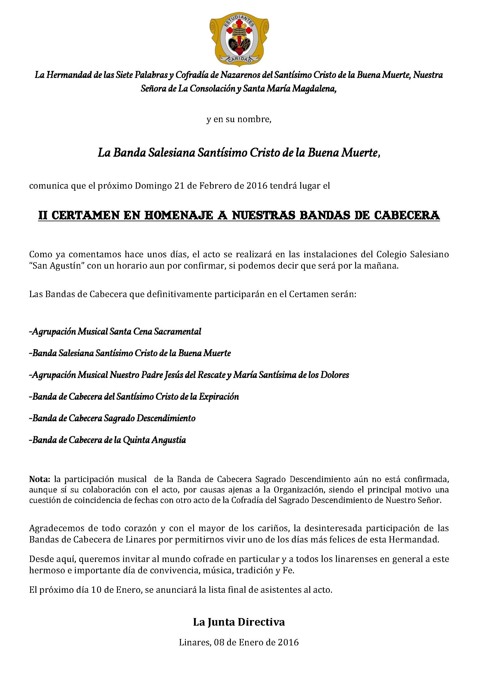 La Banda de Cabecera de la Hermandad de los Estudiantes organizará un gran certamen con la mayoría de las Bandas de Cabecera de nuestra ciudad en el colegio salesiano San Agustín. Un gran acontecimiento musical a altura de estas formaciones musicales con tanto arraigo en nuestra Semana Santa. Desde esta página web de la Agrupación de Cofradías se irá informando se las novedades que rodeen a este Certamen Musical de Bandas de Cabecera Linarenses.