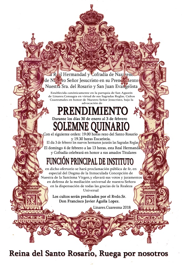 Semana destacada para la Hermandad del Prendimiento y Rosario, que está celebrando durante estos días, en su sede canónica, la Parroquia de San Agustín, los Cultos de Reglas (Quinario) en honor de su sagrado titular, Ntro. Señor Jesucristo en su Prendimiento. A partir de las siete de la tarde comienza el rezo del Rosario, siendo la Eucaristía a las 19:30 horas. El sábado 30 tendrá lugar la bienvenida a los nuevos hermanos de la Cofradía. Ya el domingo, 4 de febrero, se desarrollará la Función Principal de Instituto a Nuestros Sagrados Titulares con protestación de fe pública y jura de reglas. Presidirá la Sagrada Cátedra el director espiritual de la Hermandad, Rvdo. Sr. D. Francisco Javier Águila López.
