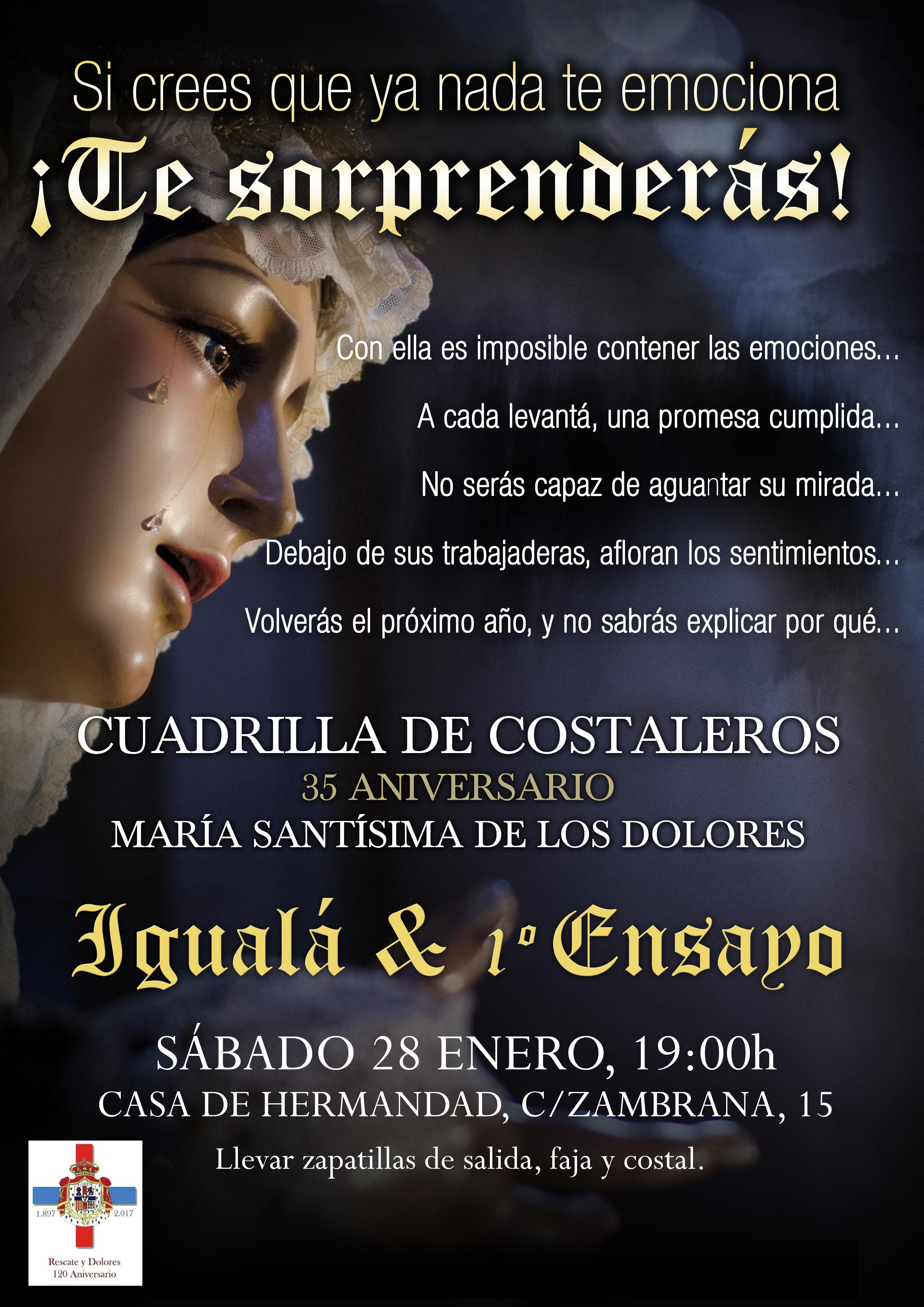 El próximo día 26 tendrá lugar la igualá y primer ensayo del palio de María Stma. de los Dolores de la Hermandad del Rescate.Esta cuadrilla celebra su 35 aniversario.