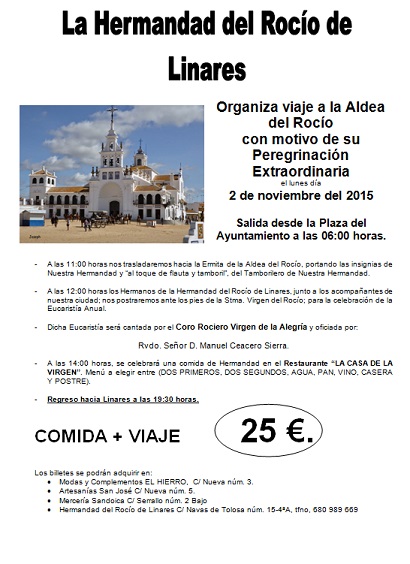 La Peregrinación Extraordinaria tendrá lugar el 2 de noviembre. La Eucaristía en la Ermita de Ntra. Sra. del Rocío será presidida por Rvdo. Sr. D.Manuel Ceacero Sierra y cantada por el " Coro de la Alegría".
