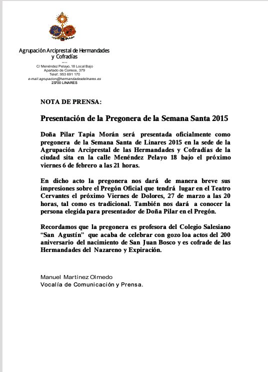 Este próximo viernes será presentada la Pregonera de la Semana Santa 2015 Doña Pilar Tapia