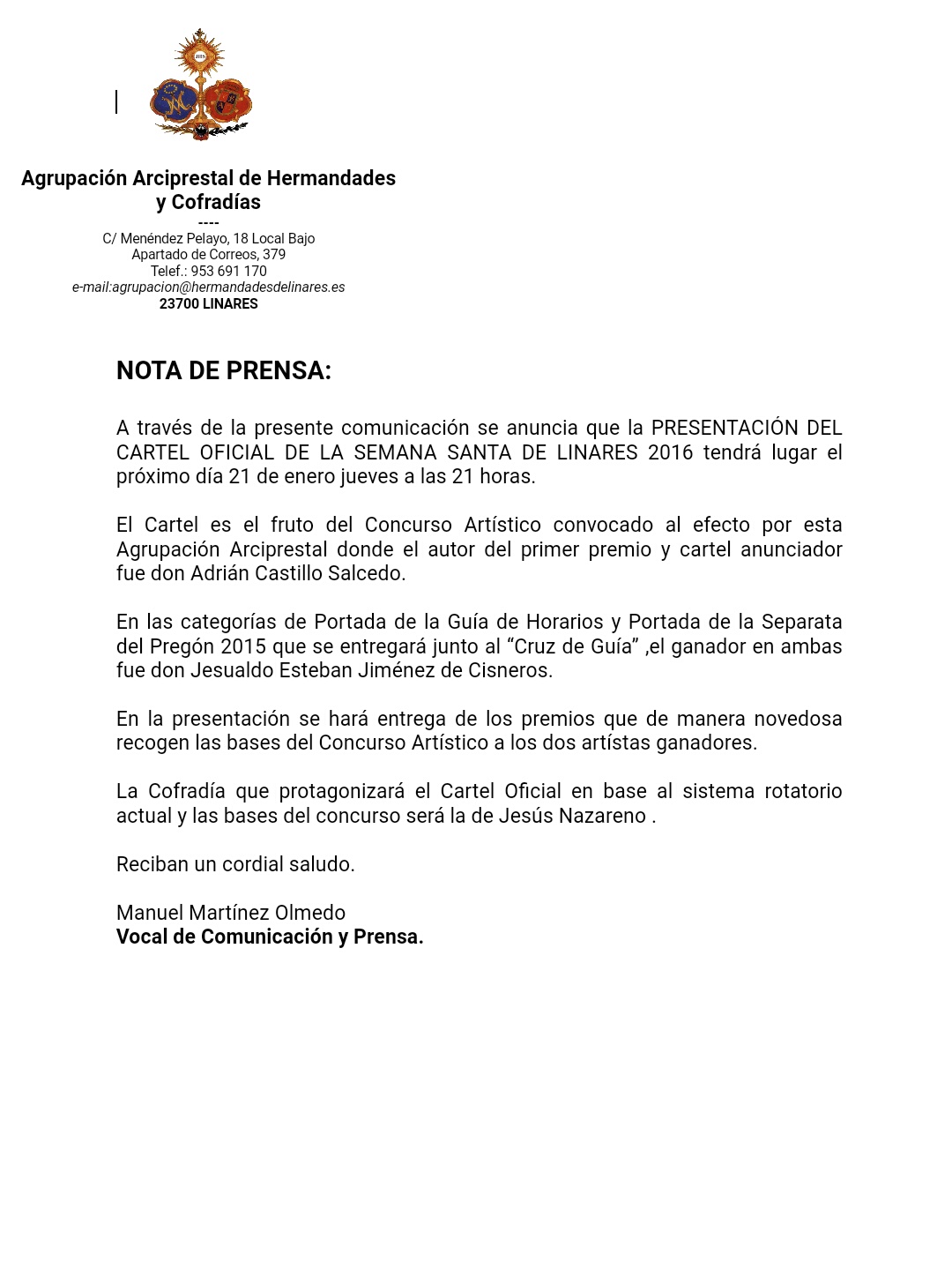 Este próximo jueves 21 Presentación Cartel Oficial Semana Santa 2016