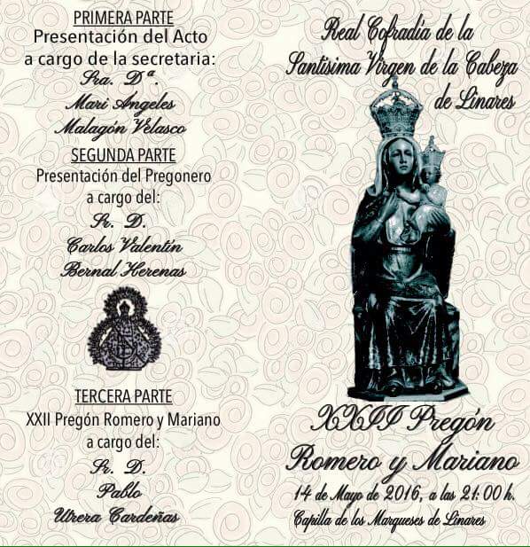 La Real Hermandad de la Virgen de la Cabeza de Linares celebrará el sábado 14 de mayo a las 21 horas su XXII Pregón Romero y Mariano a cargo de don Pablo Utrera Cardeñas . El lugar elegido será la capilla de Hospital de los Marqueses de Linares.