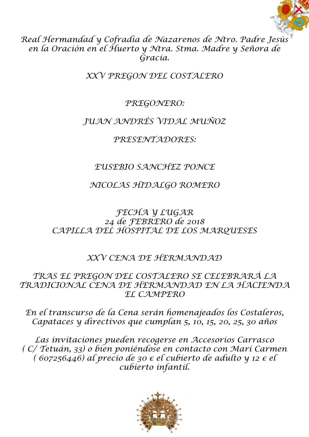 La Hermandad de la Oración en el Huerto celebra este sábado, a partir de las 18:30 horas, la vigésimo quinta edición de su Pregón del Costalero. Será en la Capilla del Hospital de los Marqueses, siendo este año el pregonero D. Juan Andrés Vidal Muñoz. Tras el acto tendrá lugar la tradicional cena de Hermandad.