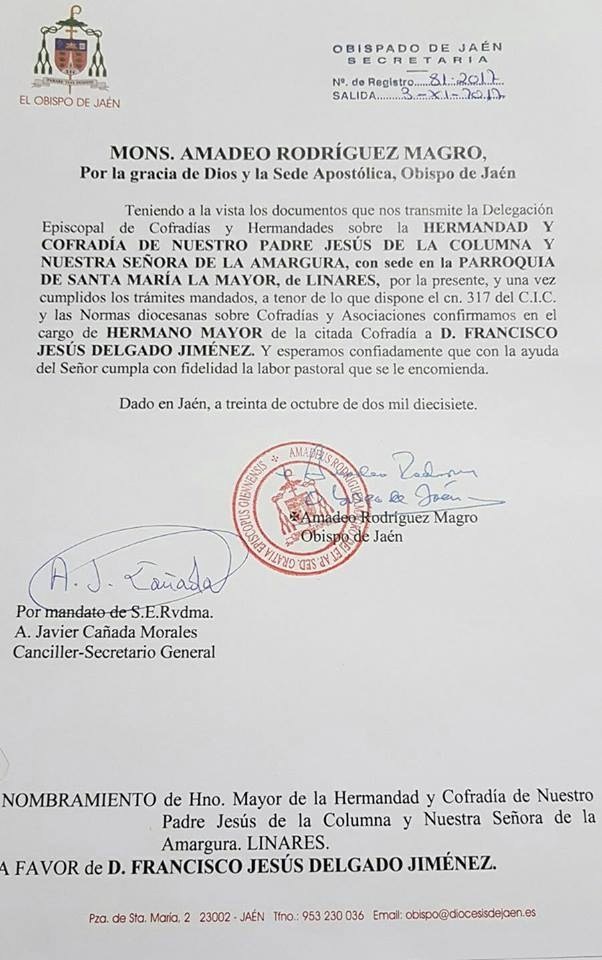 Tras las elecciones celebradas el pasado 8 de octubre, la Diócesis de Jaén confirma en el cargo de Hermano Mayor de la Hermandad de La Columna a Don Francisco Jesús Delgado Jiménez. La toma de posesión y jura de cargos de la nueva Junta de Gobierno será este domingo, 12 de noviembre, durante la Función Principal de los Cultos en honor de Nuestra Señora de la Amargura, titular mariana de la Cofradía. Desde estas líneas felicitamos al Hermano Mayor por su reelección y le deseamos que, bajo el amparo de sus sagrados y venerados titulares, tenga un próspero mandato.