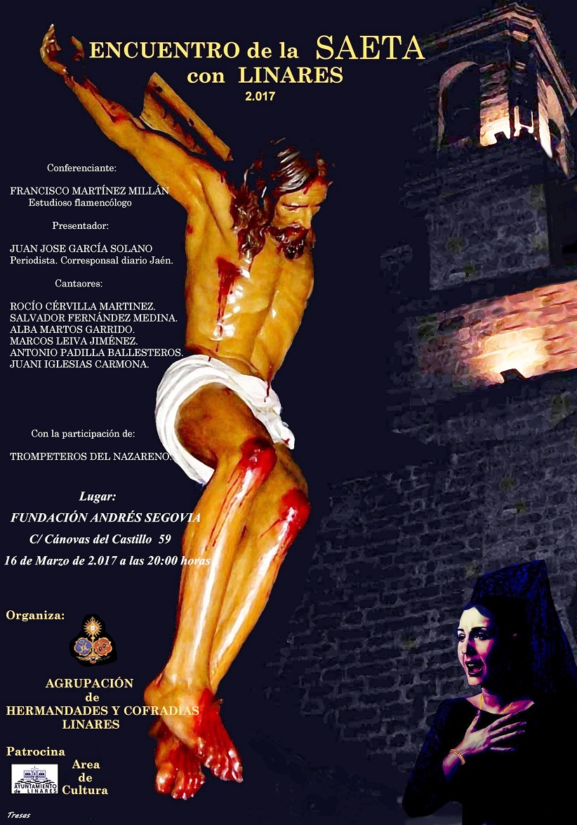 La Agrupación de Cofradías vuelve a organizar el "Encuentro de la Saeta con Linares" en un acto ya tradicional en la Cuaresma linarense. Se celebrará en la Casa Museo Ándres Segovia a partir de las 20 horas con un importante elenco de saeteros de nuestra ciudad, así como la presentación del periodista Juan José García Solano , el sonido de los trompeteros del nazareno y las sabias palabras del flamencólogo Francisco Martínez Millán.