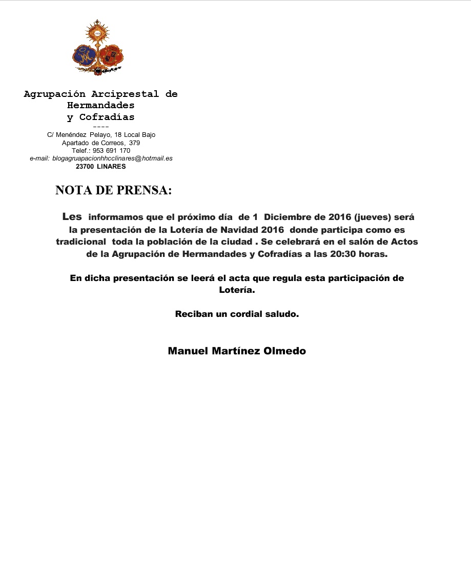 La Agrupación de Cofradías presentará la Lotería de Navidad de la ciudad