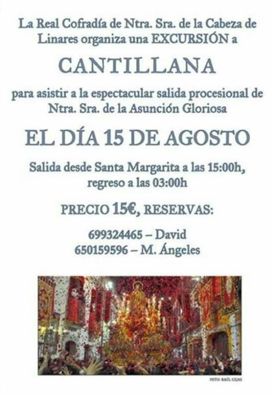 La Cofradía de la Virgen de la Cabeza de Linares ha organizado un viaje para asisitir a la Procesión de Nuestra Señora de la Asunción en la localidad sevillana de Cantillana. Dicha Salida Procesional se celebra con gran júbilo cada tarde noche del 15 de agosto puedíendose ver calles bellamante engalanadas, un acompañamiento musical y unas cuadrillas de costaleros de gran categoría, aunque sin duda lo más destacable es la pasión con la que los cofrades de Cantillana viven la salida de Nuestra Señora de la Asunción por sus calles.