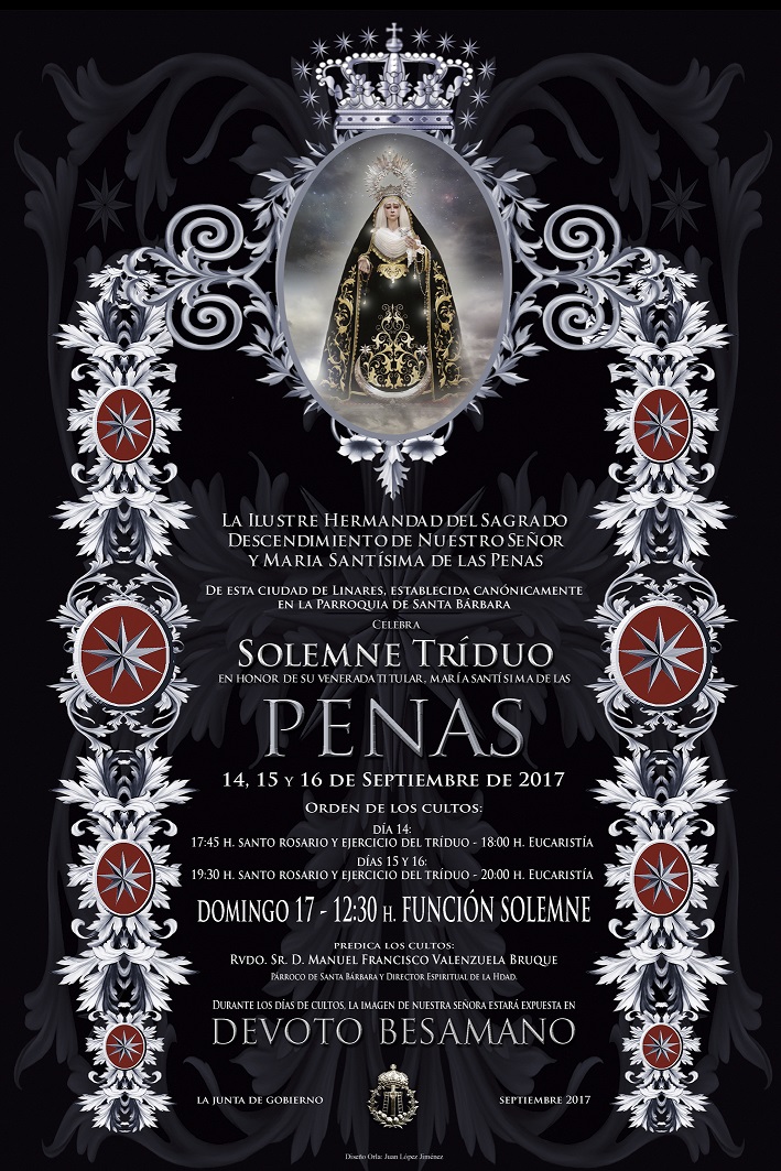 Durante los días 14,15 y 16 septiembre la imagen de María Stma. de las Penas celebrará triduo y el 17 función solemne en su parroquia de Santa Bárbara.
