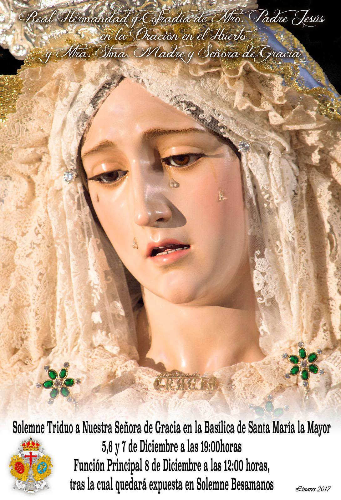 La Basílica de Santa María la Mayor acoge mañana, a partir de las siete de la tarde, la celebración del Solemne Triduo en honor de Ntra. Sra. de Gracia, Titular Mariana de la Hermandad de la Oración en el Huerto. El viernes 8, a las doce del mediodía, tendrá lugar la Función Principal, tras la cual la Virgen quedará expuesta en Devoto Besamanos.