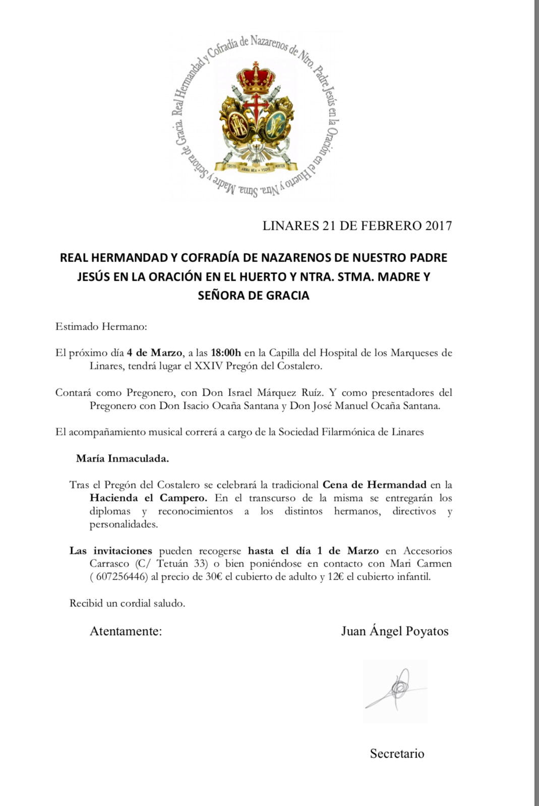 El próximo 4 de marzo a las 18.00 horas en el Hospital de los Marqueses tendrá lugar el XXIV Pregón del Costalero a cargo de Don Israel Márquez Ruiz. Presentan el acto Don Isacio y Don José Manuel Ocaña Santana. La hermandad ha editado una nota con los detalles del acto y cena posterior.