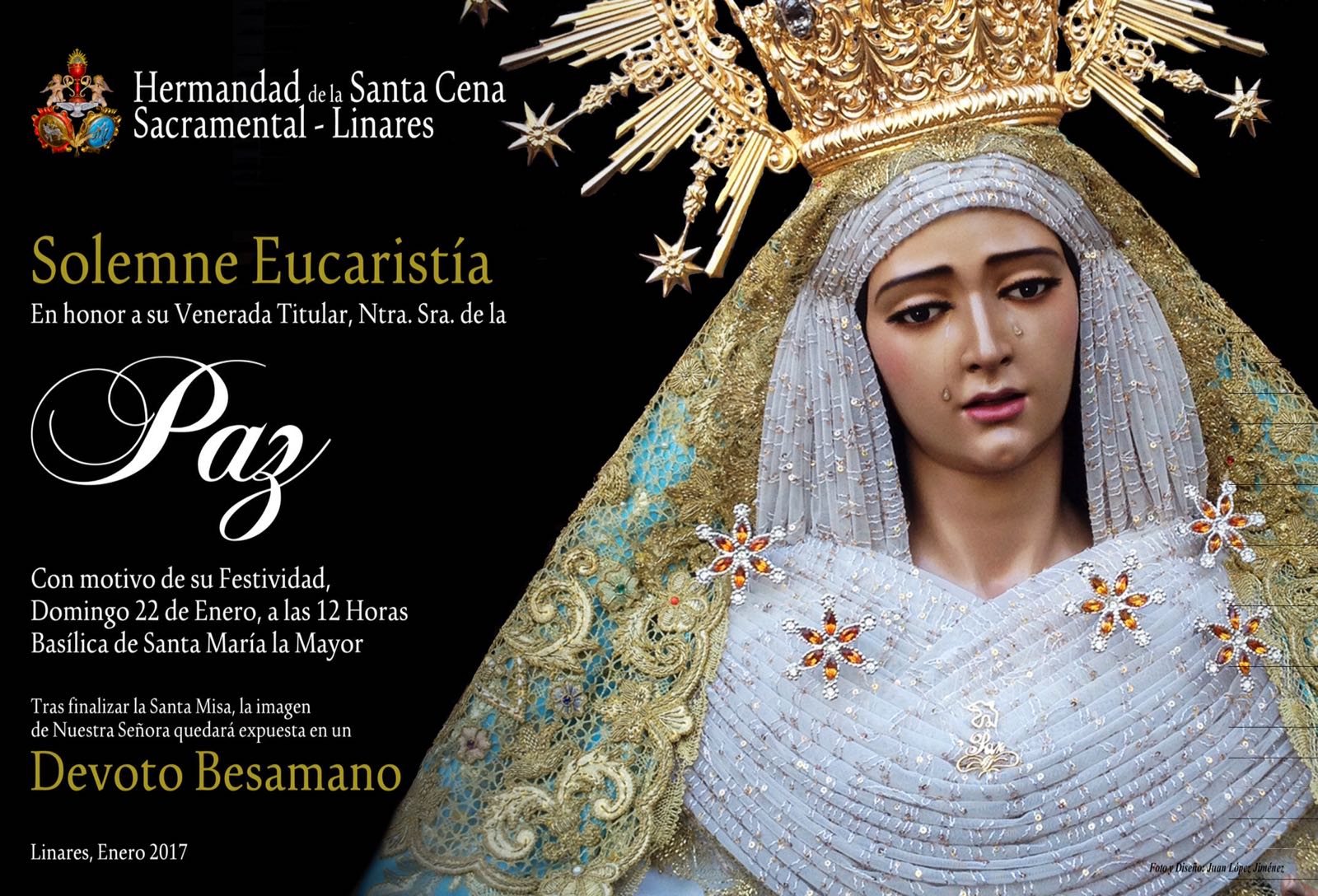 El próximo domingo 22 la Santa Cena Sacramental celebrará la festividad de Ntra. Sra. de la Paz con una Eucaristía en su sede canómica a las 12 horas. Al concluir la celebración la Virgen de la paz se expondrá en besamanos.