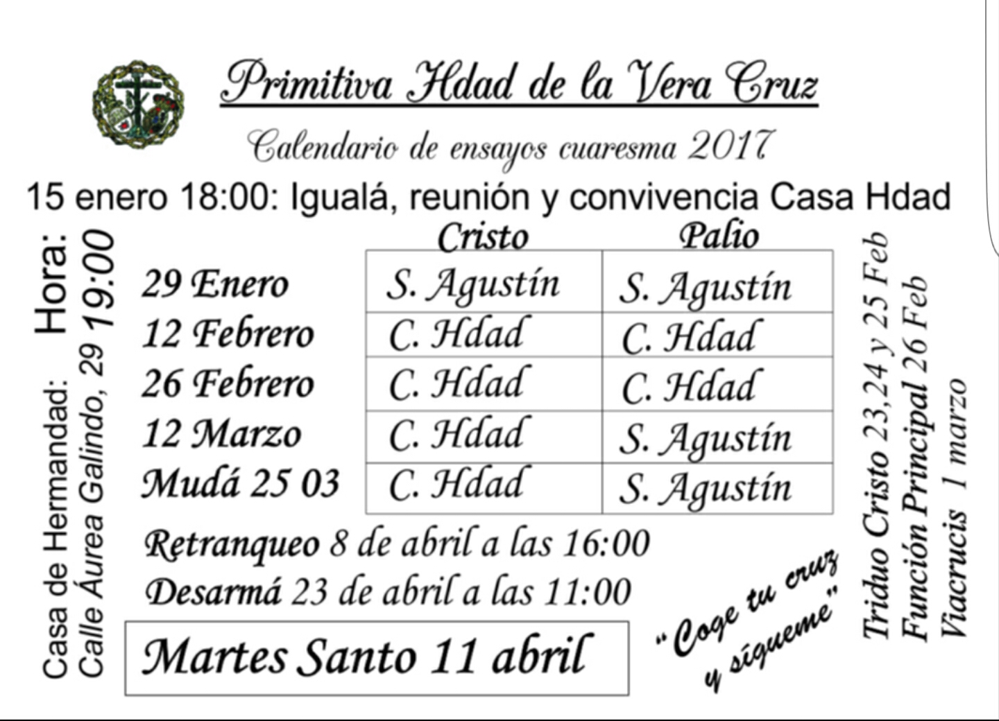 La Hermandad de la Verz+Cruz ha editado este calendario de igualá y ensayos cara a esta cuaresma y Martes Santo 2017.