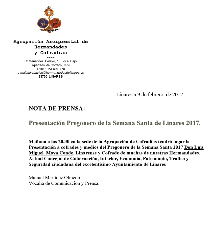 Mañana Presentación del Pregonero de la Semana Santa 2017 Don Luis Miguel Moya Conde