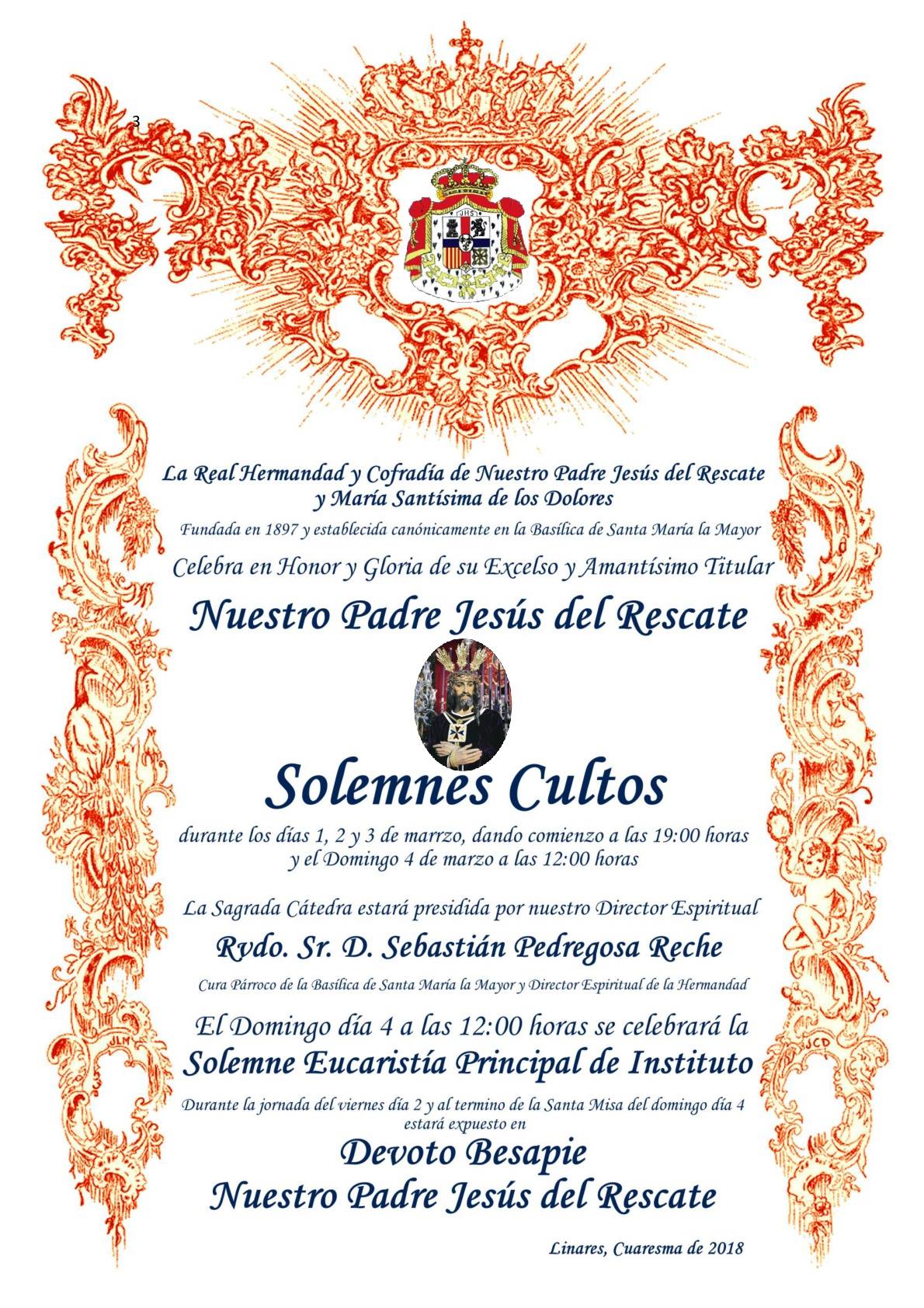 La Hermandad del Rescate y Dolores comienza mañana, a partir de las 19:00 horas, el Solemne Triduo en honor de su Titular, Ntro. Padre Jesús del Rescate. El día 2 de marzo, Viernes Trinitario, habrá Besapié al Cristo, al igual que tras la Función Principal, que será el domingo, día 4, a las 12:00 horas. Ocupará la Sagrada Cátedra don Sebastián Pedregosa, párroco-rector de la Basílica de Santa María la Mayor.