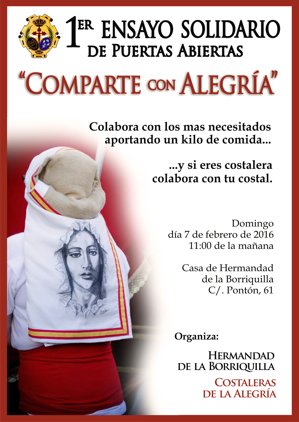 Bajo el lema " Comparte con Alegría" la Hermandad de la Borriquilla realizará un ensayo con fines solidarios el próximo días 7 domingo a las 11 de la mañana.