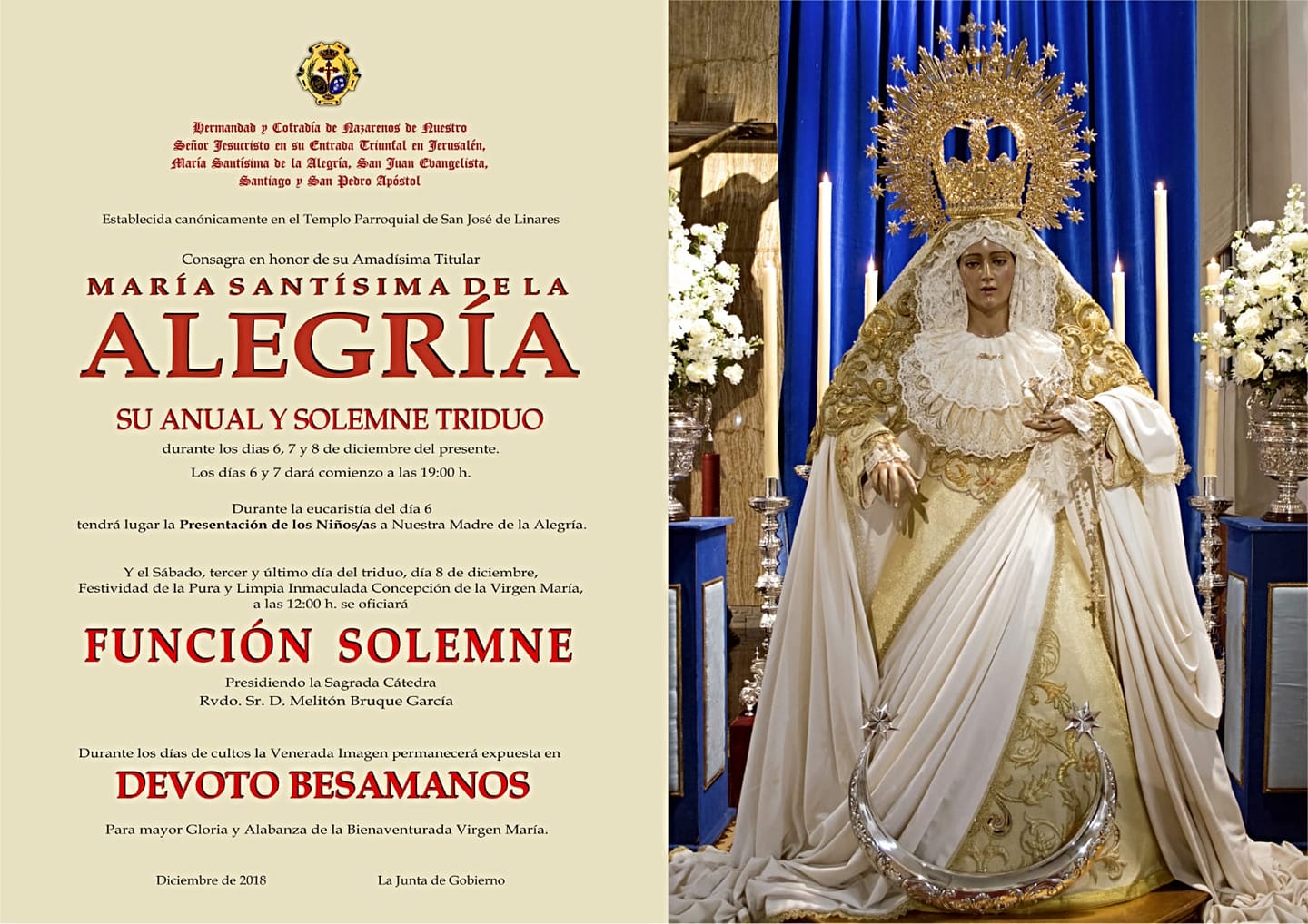 La Hermandad de la Borriquilla celebra esta semana el Solemne Triduo en honor de su Titular, María Santísima de la Alegría. La Función Solemne tendrá lugar el sábado, día 8, a partir de las 12:00 horas, en la Parroquia de San José.
