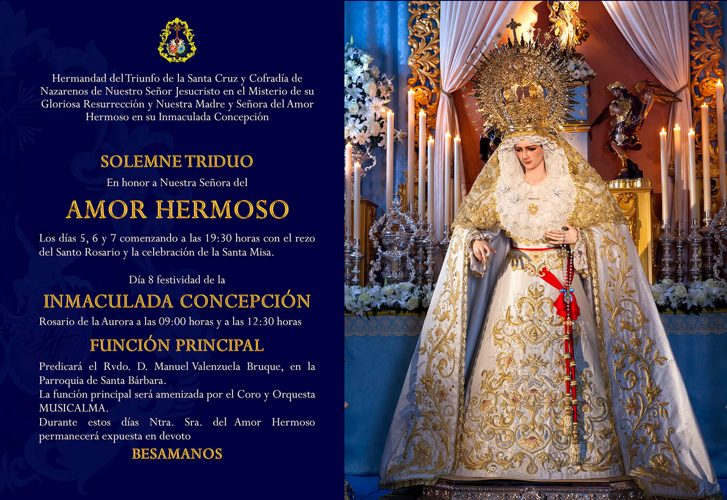 La Hermandad de la Resurrección celebra del 5 al 8 de diciembre, en la Parroquia de Santa Bárbara, los Solemnes Cultos en honor de su Titular Mariana, Ntra. Madre y Sra. del Amor Hermoso en su Inmaculada Concepción. El Triduo comenzará a las 19:30 horas mientras que la Función Principal (día 8, Festividad de la Inmaculada) será a las 12:30 horas, con un Rosario de la Aurora a las nueve de la mañana. También el viernes 8, durante la Eucaristía, se procederá a la toma de posesión de la nueva Junta de Gobierno de la Cofradía, encabezada por don Francisco José Domínguez como Hermano Mayor.
