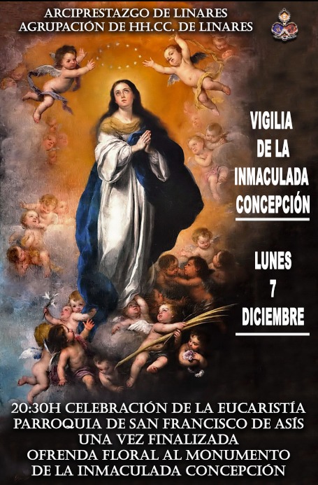 Hace apenas unos días, y a pesar de la pandemia de Covid-19, pudimos celebrar la Vigilia de la Inmaculada en este año 2020. La eucaristía, presidida por nuestro Consiliario, Rvdo. Sr. D. Sebastián Pedregosa Reche, tuvo lugar en nuestra sede canónica, la Parroquia de San Francisco, y fue concelebrada por diferentes sacerdotes del Arciprestazgo de Linares. Tras la misa se procedió a la ofrenda floral tradicional en el monumento a la Inmaculada Concepción, ubicado en la Plaza de San Francisco.
